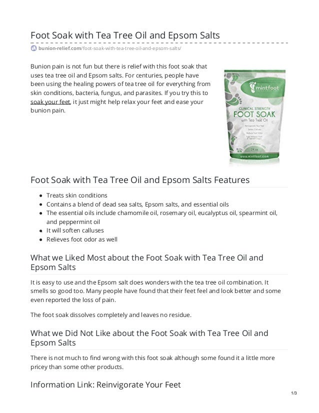 An article of the american college of healthcare sciences, however, recommends soaking for only 10 minutes, and states that toxins your body has eliminated during the soak will be reabsorbed after 10 minutes. Put 3 tablespoons of epsom salt with warm water in a bowl large enough for your foot. Add half a cup of salt to the water. He said epsom salt can help in several ways, including: Epsom salt (foot care aisle) soak the foot in a bath of warm water and epsom salt for 15 minutes twice a day for three to five days.